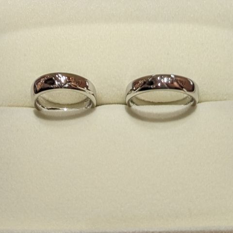 夫→(たしか)11号、プラチナ、幅3.0mmマット加工、レディッシュコニャックダイヤ 私→(たしか)5号、コーラルゴールド、幅(たしか)2.3mm、ダイヤ 2人で色違いだけど同じデザイン 裏には★マークの手彫り