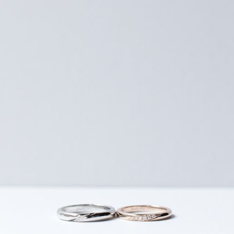 嫁はピンクゴールドベースの一部プラチナ。旦那はプラチナベースの一部ピンクゴールドで、同じデザインながら少し雰囲気の異なるペアリングにしてもらいました。鎚目、石地仕上げで、使用していくうちに表面が滑らかになって雰囲気が変わっていくとの事で毎日付けておきたくなるギミック付きです。
