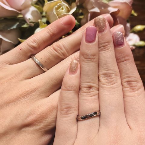 色々と試着させてもらい、自分達にぴったりのデザインを選べたと思います。今はペアのデザインにするのではなく、それぞれ好きなデザインを選んで自分たちだけのペアにする人が増えていると聞き、自分たちにあったデザインをそれぞれ選ぶことにしました。