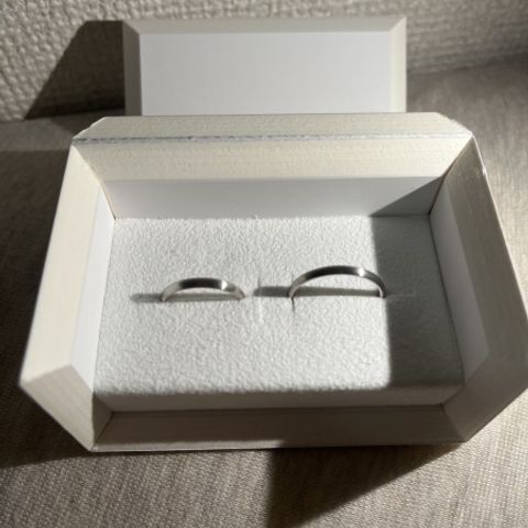 シンプルで飾らないところが私たちらしさを表しているようで即決でした。外側はマットで、内側がキラキラしていて、指輪を外した時も目で見て楽しめる点が気に入ってます。また、着け心地も良く、ある意味付けているけど付いてないような普段使いに馴染むつけ心地です。