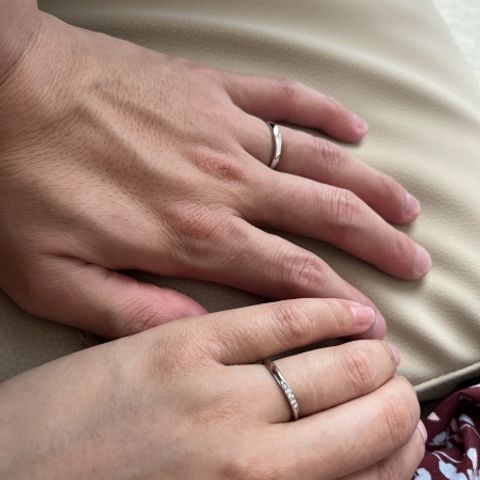 二人で同じシリーズのものではありませんが、それぞれ気に入ったものを選びました。最初はダイヤはいらないかなと思っていましたが、実際にダイヤのついた指輪をつけてみるととってもかわいくて、結局ダイヤありを選びました。スタッフの方にも、同じシリーズではないけれど2つ並べたときにペア感はあると推してもらったので大満足です。