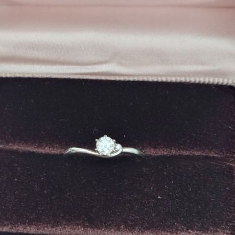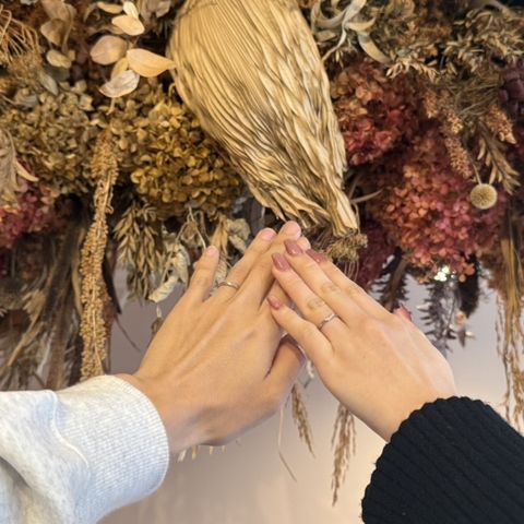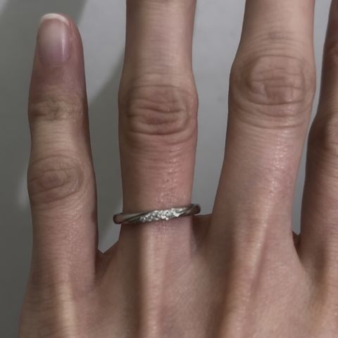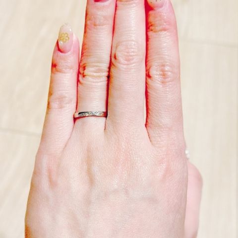 来店する前からいいなと思っていた指輪を、実際に着用させていただきました。他のデザインも見せていただきましたが、あまり悩まず今回のデザインに決まりました。ダイヤが斜めに入っているので特別感もありつつ、ギラギラしすぎないので普段使いもできそうで気に入っています。
