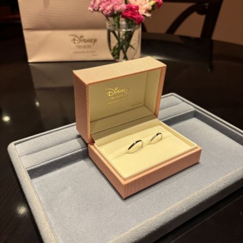 デザインはウェーブでウェーブしているところはゴールド、それ以外はシルバーにしていただきました。指輪の内側にミッキーとミニーの刻印をいれていただいて、可愛かったです。2つの指輪を重ねるとハートの形ができるようになっている点も良かったです。