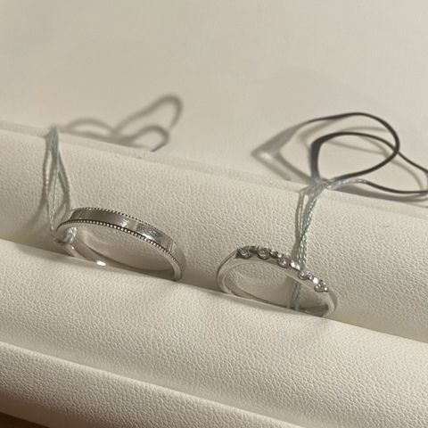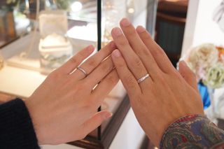 婚約指輪→一粒石か、3連のものにするか迷いましたが、一粒石のものにしました。3連のものだと、キラキラ具合は良かったのですが、やはり飽きのこないベーシッ クなデザインなものが良かったのと、一粒石の方が、カジュアルすぎない感じが良かったです。 結婚指輪→パートナーとお揃いのデザインがよく、お揃いのものがあるものを購入しました。私のはダイヤが斜めに入っているデザインで、パートナーのものは、ダイ ヤは入っておりませんが、斜めにラインが入っていて、そこの境目でリバーシブルデザイン、普通のシルバーと、マットデザインのもので、日によって変えられるのが 良かったです。