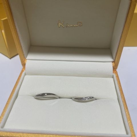 ウェーブラインの指輪で指が綺麗に見えます。新郎は毎日指輪を着用予定なのでシンプルなものを、新婦のものは仕事の関係で毎日着用しないので、キラキラしているものにしました。着用時に着けている感を減らすために薄く仕上げてもらいました。