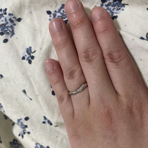 シンプルかつ、ウェーブでおしゃれさを出しているところに惹かれました。細くていかつさがないところも指に合いました。ダイヤモンドがキラキラ光りパソコン作業などをしている時に目に入って嬉しくなるのがお気に入りのポイントです。