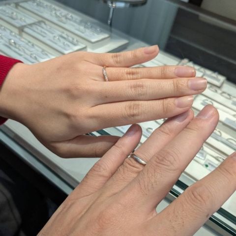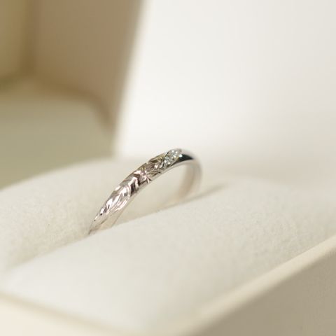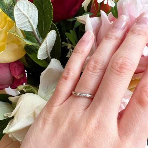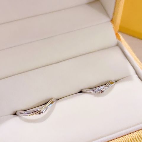 婚約指輪はいらないので、その代わりに結婚指輪のダイヤの主張を強くしたく既製品のアレンジオーダーさせていただきました。指輪の形もV字型で指が長く見え、プラチナとピンクゴールドの組み合わせでとても可愛くて気に入っています。