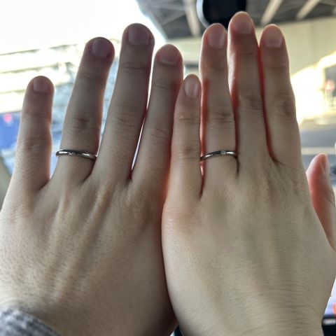 自分たちが年をとっても恥ずかしくないような、シンプルなデザインに落ち着きました。少し幅が広めなのが、ファッションジュエリーではなく結婚指輪なのだという存在感があって気に入っています。女性側にはダイヤモンドがついているのですが、シンプルに1個入っているのが良かったです。