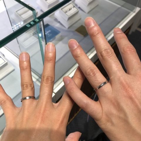 他の人と被らないようなデザインに出会えた。 そのままでも存在感があって、重ね付けもできる。そんな結婚指輪を探していたので、ぴったりな物を見つけることができて良かった。手の形から診断してもらって、少し斜めになっているデザインを選びました。