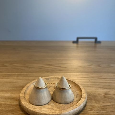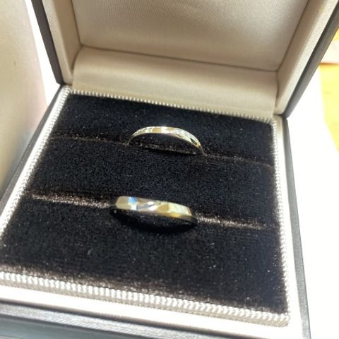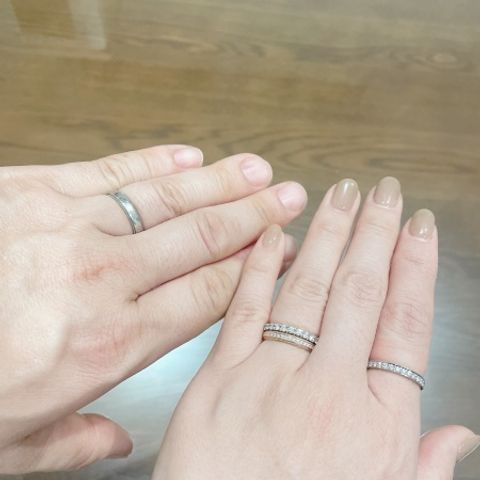 結婚指輪はどちらもウェーブの指輪になってるのでシンプルながらも日常使いでも飽きのこないデザインとなっており好印象です。 セットリングなので婚約指輪とのウィット感もよく仕事のときは結婚指輪のみ、プライベートでは婚約指輪も付けておでかけ、という形がとても新鮮です。