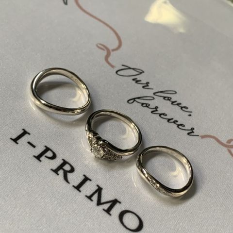 結婚指輪にアイプリモのフレイを選びました。ダイヤが上品なサイズで日常でも付けていてさりげなく光って可愛いです。 結婚10年目に、アイプリモのマーニ・フルを購入しました。どうしてもフルがほしくて、電話予約して伺いました。とってもキラキラで見惚れます。合わせて付けたくてパエンナも一目惚れして購入しました。重ね付けするとテンションが上がります。