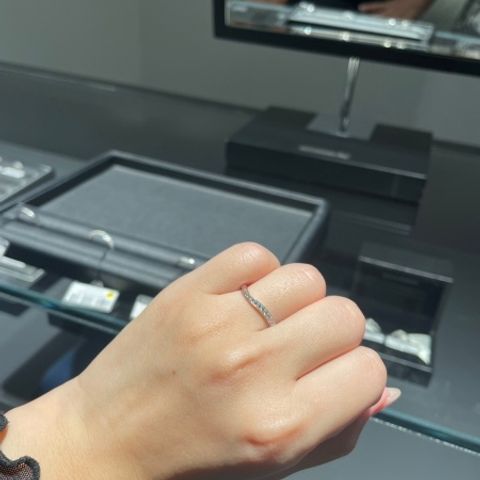 夫婦共に仕事中は指輪をつけられず休日のみの着用になるので、ダイヤモンドでキラキラのものもいいなと思いこのブランドのハーフエタニティにしました。 他の指輪をはめると違和感があったのですが、こちらのものは自然なつけ心地で、光にあたるとキラキラ光ってすごくテンションがあがります。