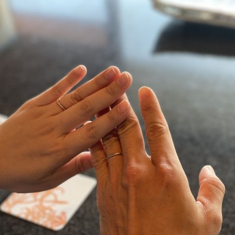 ストレートなデザインの指輪が多い中、ねじれのあるデザインが気に入ってこの指輪を購入しました。付け心地もとても良く、日常的に付けていても全く気になりません。太さも選ぶことができ、指が2人とも細いので、細い方にしました。