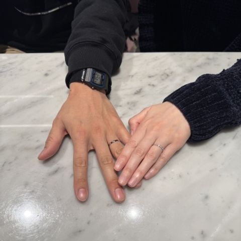 女性の指輪はダイヤ5粒付いていながら普段使いできるような派手すぎないデザインで気に入っています。男性の指輪は一部マット加工が入っていて、個性的だが普段使いしやすいデザインです。指の裏面が薄い作りになっているので付け心地も自然で、この指輪を選んでよかったと思います。
