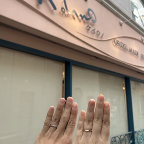 流れるようなデザインが優しい印象で好きです。 手を動かすたびにダイヤモンドがきらめくので、試着の時点で何度も手元を見てしまいました。 セミオーダーでダイヤモンドのランクを上げたことで、さらにきらめきが増してお気に入りです。 旦那の方のリングは太めですが、同じく流れるような優しいラインでいかつくなりすぎないところが良いです。