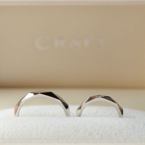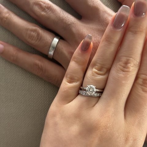 婚約指輪は仕事柄普段使いできない分、結婚指輪は人とは被らないデザインで選びました。ミル打ちと中心のダイヤモンドで豪華な仕上がりになり、大変満足しています。夫の指輪は肌に馴染むようミル打ちは無くし、ファッションリングっぽくならかいように艶を出してもらいました! 婚約指輪は結婚指輪と重ねた時に馴染むようシンプルなものを選びました。