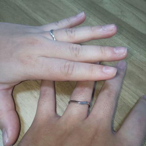 普段指輪をつけないので、つけやすくシンプルなデザインが良くて気に入ってます。カスタムオーダーでお互いに色はこだわりがあり同じにはできなかったのですが、色々と見比べて二人で選ぶことができたので良かったです。