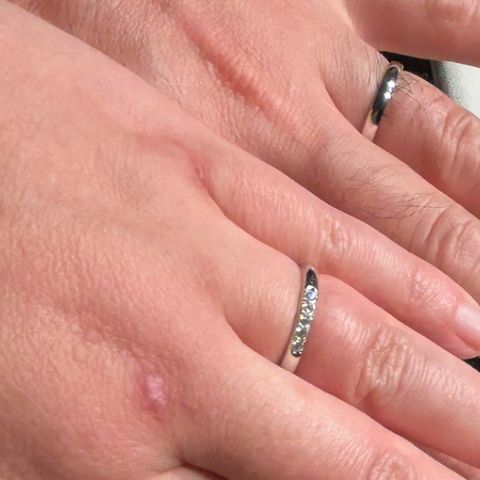 メレの5粒がキラキラ光りとても綺麗です。幅は太すぎず細すぎず、パソコン作業時指輪が気になりいつも外していましたが、着用感よく、つけていても気になりませんし外れないです。 プラチナでとても美しく、それなりに高そうに見えますがコスパに非常に優れています。 旦那さんは肌がかぶれやすく、水仕事のため、内側がチタン製外側がプラチナを選び、喜んでました。
