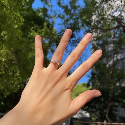 シンプルなデザインが好みで、あまり派手すぎない指輪にしたかったです。デザインはシンプルですが、ダイヤモンドの輝きがさらに目立ってとても綺麗だと思います。重ね付けで結婚指輪と一緒につけてもよく交わってよかったです。