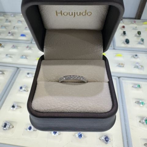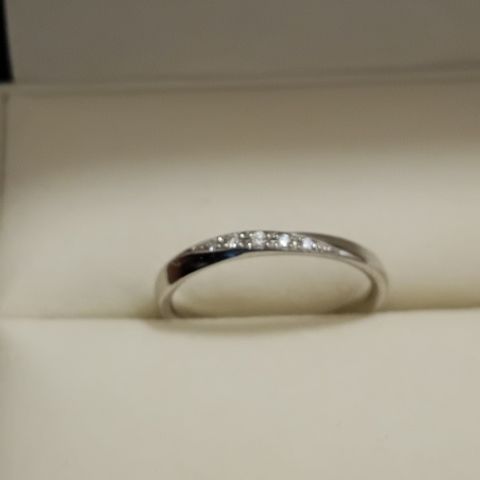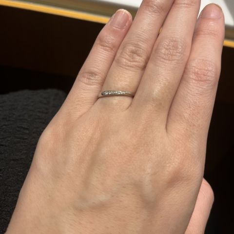細身のハーフエタニティリングです。最初試着をしていた際、ダイヤが窮屈に見えない細身のデザインのハーフエタニティリングを求めていたのですが、ありませんでした。その旨店員さんに伝えたところ、求めていたデザインのファッションリングを持ってきてくださり、ブライダル用の素材で同じデザインのリングを作ってもらいました。