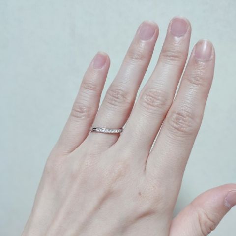 ウェーブタイプで指が綺麗に見えて長く見えるのが決めて手でした!ウェーブタイプも色々あって悩みました。ダイヤモンドの配置で見え方もすごく変わりますし、ストレートタイプとウェーブタイプのいいとこ取りの指輪もあったりと悩みましたが見え方重視でこちらを選びました!
