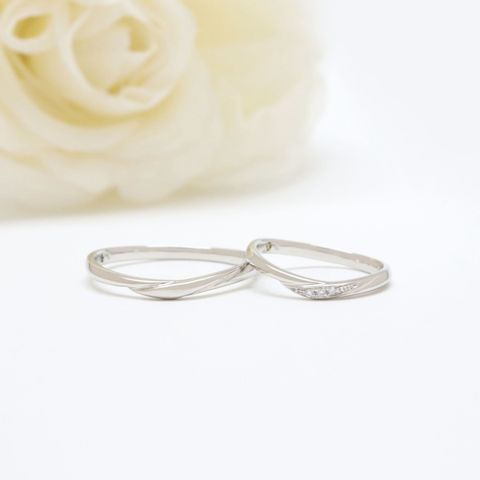 ウェーブです。 女性側には細かなダイヤが少しあり、少しキラッとしていて可愛いです。 男性側はウェーブだけどもウェーブ感強すぎず、シンプルめです。 細めで薄め、内側もつけ心地考えられており、指長くなくても邪魔にはなりにくいです。