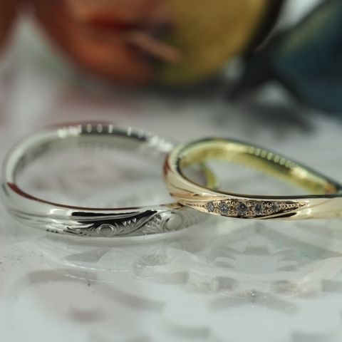 男性用は若干ウェーブがかっていて、特にデザインはないシンプルなものです。女性用はウェーブでダイヤが一つのシンプルなデザインです。 ストレートのものも着用しましたが、一番指がきれいに見えました。価格も予算程度の2人で20万円程度でした。