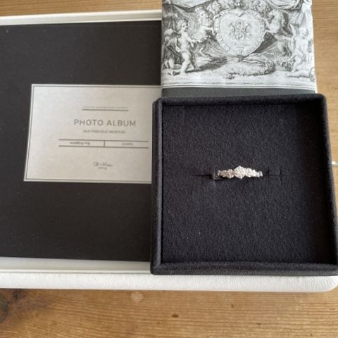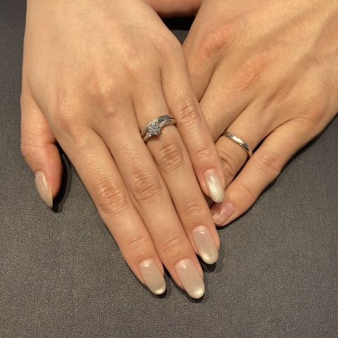 お互い再婚同士なこともあり、予算は控え目で探していました。 何件か実店舗を回りましたが理想のリングと出逢えず…ネットで検索してこちらのお店に目がとまり伺いました。 結果、価格・デザイン・素材全て満足のいく素敵なリングを見つけてセミオーダーしました。 エレガントなカーブと可愛いダイヤがキラキラで大満足です。