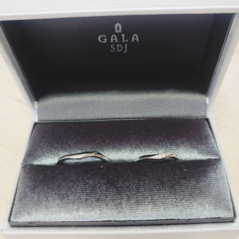 女性の指輪はGALA SDJ店さん限定のデザインになります。元々はピンクゴールドで作られているデザインのものですが、プラチナにしていただきました。上下にキラキラと輝くメレダイヤが入っておりとても素敵です。