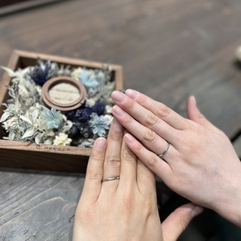minaジュエリーさんは様々な選択肢がある中で、自分たちの好きな色・好きな質感など、自分でしかつくることのできないものを完成させることができます。わたしたちは仕事柄、日常で指輪をつける機会がありませんでした。そこで大切にしたことは、日常でも気軽に身につけられるような結婚指輪をつくるということです。たくさんの指輪の種類が目の前に並ぶ中、何度も何度も試着を重ね、自分たちの肌感にあう指輪のデザインを選びました。今では"結婚指輪"としてももちろんですが、ファッションの一部として、たのしみながら日常でも身につけています。