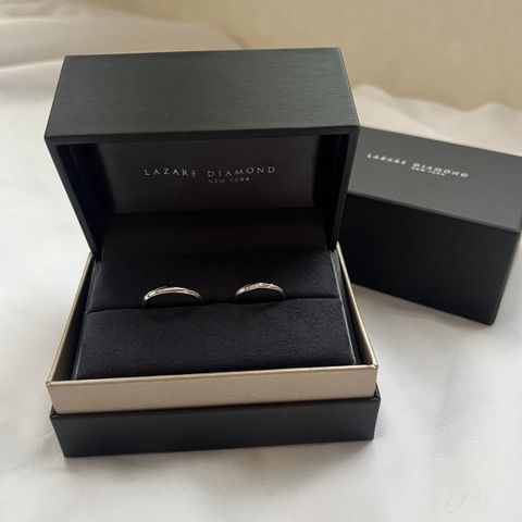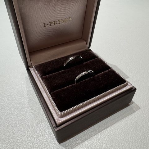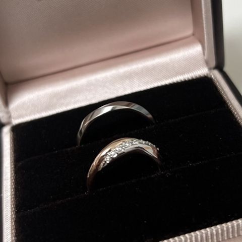 V字の形に控えめなダイヤモンド3粒付いたデザインが、婚約指輪と重ね付けした時にしっくりきて選びました。夫は超シンプルなプラチナで、色んなブランドやデザインを見て結局戻りました。普段指輪を付けられない職業なので特別な時に婚約指輪と重ねて付けて楽しみたいと思います。