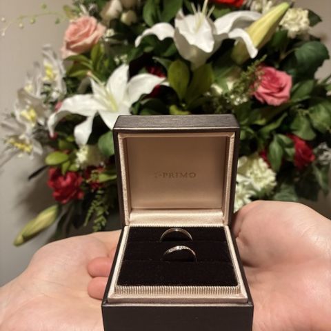 女性用はダイヤモンドを5つにし、男性用はマット加工をしました。小さめサイズ(6号?)の試着用のリングがダイヤモンド3つだったので、付けた時にリングも小さいし3つでも十分かなと思い、悩みましたが、出来上がりを見てリングが小さいからこそダイヤモンド5つが映え、とても大満足です。男性用もマット加工部分の幅が思ったよりも広くなかったので、加工してない部分とのメリハリもついてよかったです。