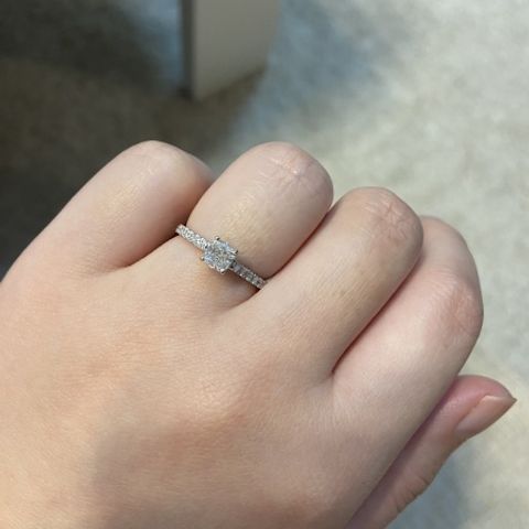 少し丸みを帯びた正方形のクッションカットダイヤが少し変わっていてかわいいですし、エタニティタイプなので着用した際キラキラしていて華やかです。 0.5カラットの大きさが指の太さに対してもちょうどいいように思いました。
