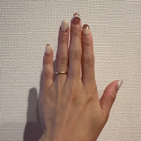 ペールブラウンゴールドの色味が気に入り購入しました。 プラチナでもゴールドでもピンクゴールドでもないちょうどいい色! 肌馴染みがとても良く手が綺麗にみえます。 二つのリングを重ねるとカーブが反対になっており、夫婦は鏡であるという意味が素敵だなと思いました。