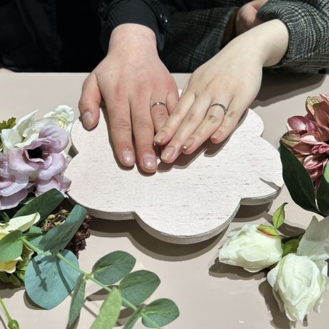 シンプルで着け心地が良く、デザインに飽きが来ないことを考えて決めました。そう言ったことを伝えると、色々なサンプルパターンを見せていただけたので、楽しく決めることができました。 また、強度を優先してより頑丈な製法を選びました。いつまでも2人で着けていられる指輪になったと思います。