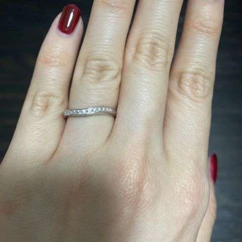 写真ではわかりづらいですが、緩いU字カーブがかかっており、エンゲージリングを重ねたけした時に、想像以上にしっくりきます。私は別のブランドのソリティアタイプのエンゲージリングですが、とても華やかになりました。