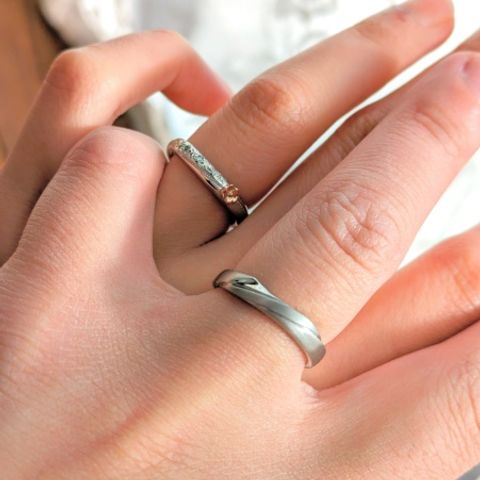 素材を一部ゴールドやピンクゴールド、イエローゴールドにしたり、一部を艶消しにしたり、自由に選ぶことができました。ウェーブの形がなめらかで、誰にでも合わせやすい指輪だと感じました。手指が大きくて太めの彼氏にも似合うようにつくることができました。