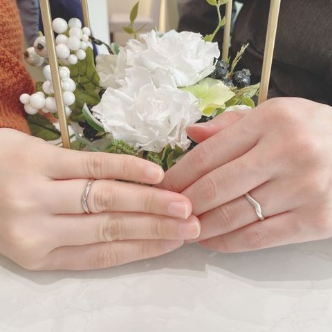 元々ウェーブのデザインが好きで、シンプルかつ仕事中でもつけれるデザインで一目惚れしました。 お店の人に聞いたところ、日本のブランドしかウエーブのデザインがないと聞き、驚きました! 指輪の裏には、刻印以外にもインフィニティダイア(一つのダイアを2人で分けて石をはめ込む世界で一つだけのダイア)やもう一つ誕生石など入れる事も可能で、自分たちの想いを込めれる指輪になりました。