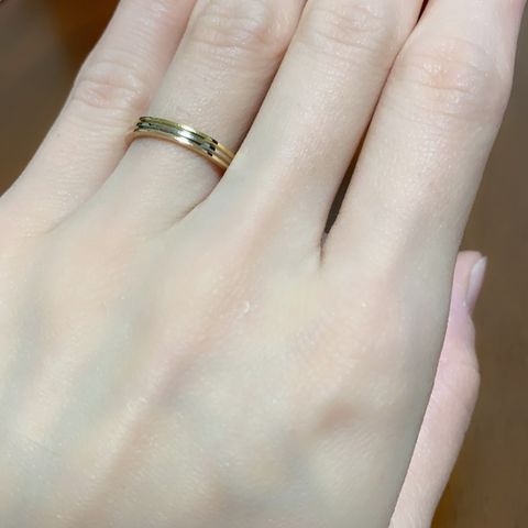 ゴールド、そして太め、一見結婚リングにみれないけれど、どんな服装にも合うし、女性らしくて可愛い。これからゴールドが増えていくと思う。重ね付けも何にでも合うので、おしゃれリングとしても、とてもおすすめですよ。