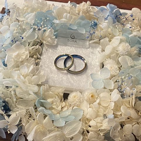 新郎新婦共に、シンプルデザインを希望でしたので、ノーマルデザインを選びましたが、せっかくなので、シンプルな中にも個性を出そうと、お互い好きな色を選び、新郎は斜めに艶消しをしてもらい、新婦は艶出して作りました。