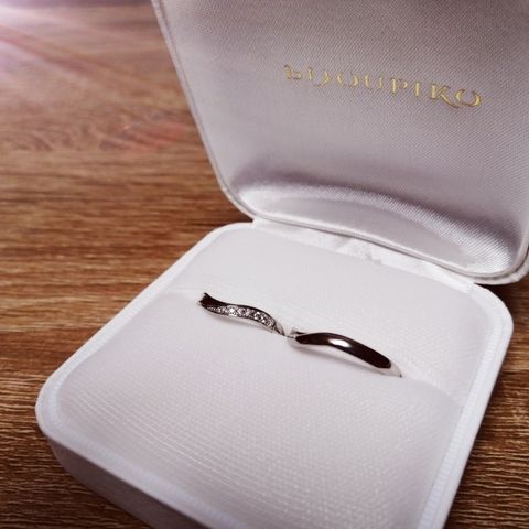 ウェーブのデザインで指が長く見え、手を綺麗にみせてくれます。メレダイヤが両サイドに付いていて可愛く、どの角度からみても素敵でした。指輪の幅が細めで、指が細い方でも似合いやすいデザインではないかと思いました。