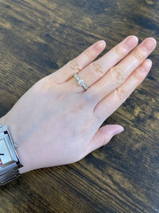 質のいいダイヤモンドを選んで頂いたようで、1つダイヤが目立つようシンプルな指輪を探していました。色々な指輪を着用させて頂き、細かなダイヤでデザインされたこちらに一目惚れしました。指輪が手元に届くまでは少し派手だったかなと思う部分もありましたが、いざ着用すると派手とは思わず綺麗で見惚れてしまいます(笑)
