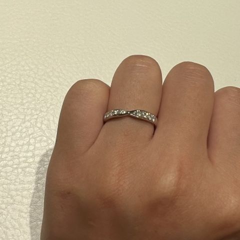 ひねりが入ったデザインにミル打ちとダイヤが目を惹きます。指輪自体も他の指輪より輝きが強めです。 他のひねりがあるデザインと比べると、真ん中ひねりのみならず、指輪の後ろの方まで深くくぼみが入っているのがお気に入りポイントでした。光の反射が強く、指につけていて何度も見てしまうほど好きなデザインです。