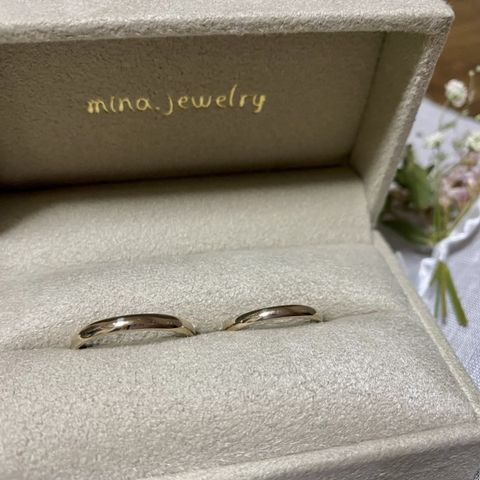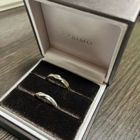 指輪のデザインはこだわりたかったのでたくさんの指輪を試着させていただきました。その中でも動きがあり、ゴールドのラインが入るものを選びました。それと内側に刻印や双子ダイヤを入れて、よりお揃い感・自分たちだけの指輪というものにしてます。