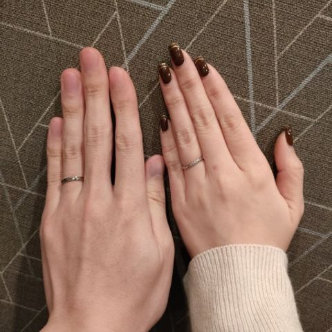 5ブランドほど周りましたが、最初に見たこちらの指輪の付け心地が忘れられず決めました。私はゴールド、彼はシルバーで色違いを希望していたので、お揃い感が欲しくて控えめなデザインに惹かれました。小さいながらも小さくキラキラ輝くのがお気に入りです。