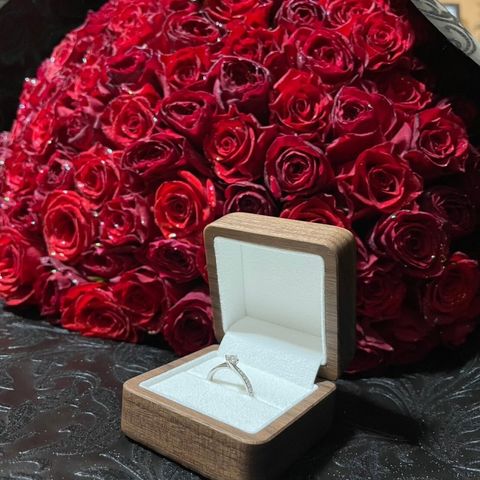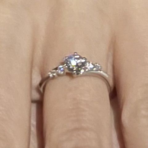 中央のダイヤと、リング部分の小さなダイヤとのバランスがお気に入りです。0.3カラットを選びましたが、大きすぎず小さすぎずで、ちょうど良いサイズだと思います。内側に刻印もできたので、自分の名前と相手の名前を彫ってもらいました。