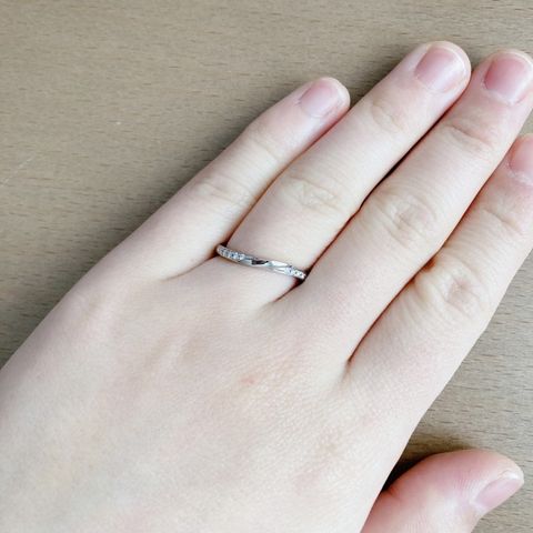 ダイヤモンドだけが付いた婚約指輪はみんなが付けてるからなと思い、少し変わったデザインを探していました。この指輪は2つのウェーブが重なって、ひとつはダイヤモンド、ひとつはシンプルなままでギラギラもしすぎず指も細く見えるのでこれがいい!となりました。直感でした。