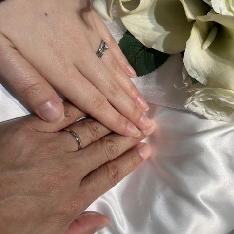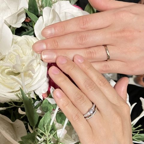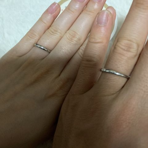 シンプルながら、女性用の方にはダイヤが入っていてキラキラしており、華美過ぎない上品なキラキラさに惹かれました。リングには女性用にも男性用にも斜めのラインが入っていて、指輪を合わせると両方のラインが繋がる二人だけにわかるデザインという点も良かったです。
