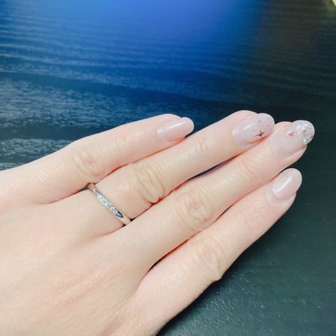 両サイドにダイヤがあしらわれており豪華さはありますが、真ん中はプラチナなので派手すぎない作りがとてもかわいいです!!細さもちょうど良くどんな場面でもつ けていられるデザインになっているので長年つけ続けられるのもおすすめです。