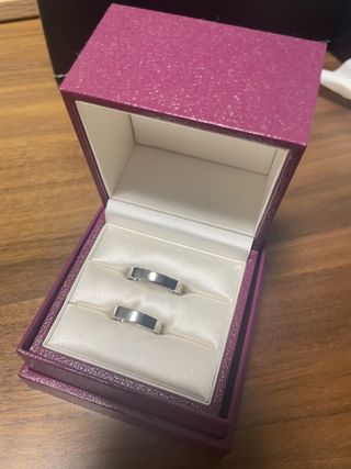 結婚指輪として利用させて頂きました。歳を重ねても飽きないシンプルなデザインがいいと感じました。色もシンプルなシルバーを選びました。また、奥さんに関しては婚約指輪を重ねてつけても違和感のないようリングがストレートタイプを選びました。